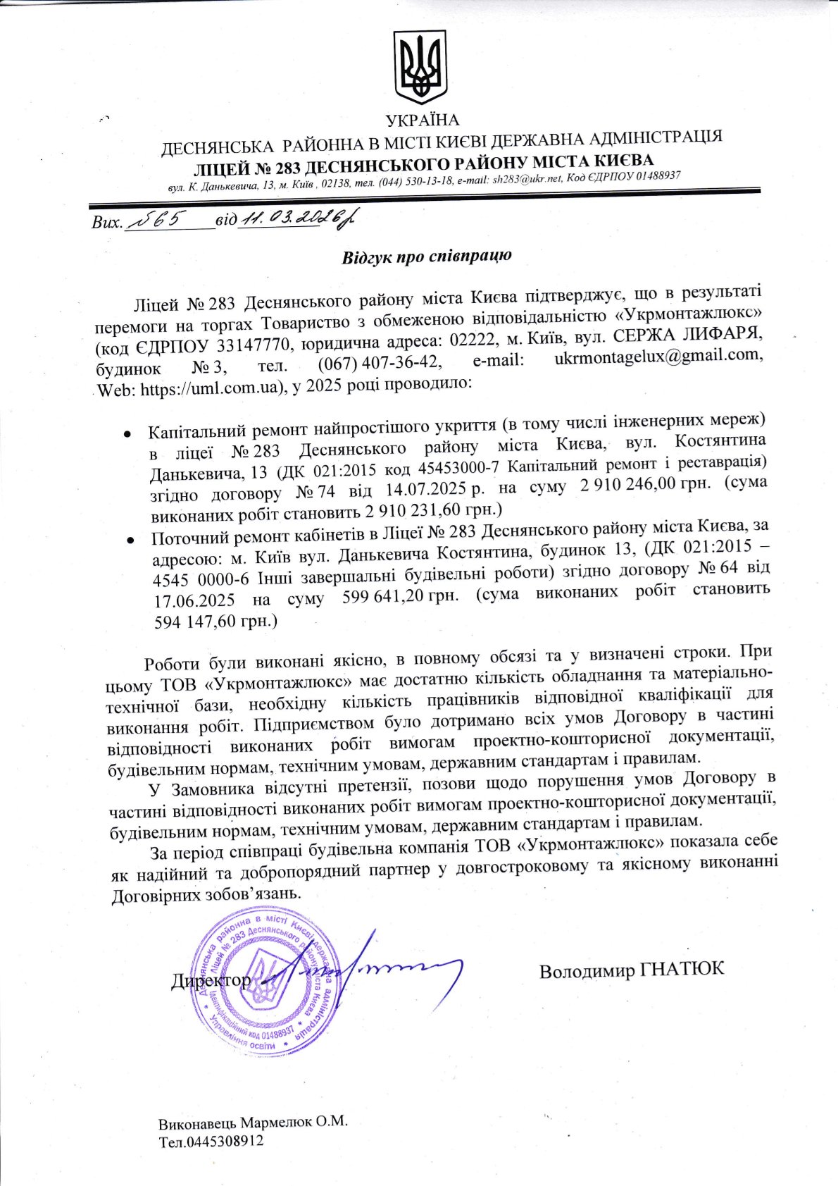 Ми працюємо на будівельному ринку України з 2004 року. За цей час наша Компанія зарекомендувала себе як надійний партнер по бізнесу і завоювала повагу своїх Замовників. На підприємстві є відповідна матеріально-технічна база, механізми і транспорт, а також багаторічний досвід проведення всіх видів будівельних робіт. У Компанії працюють фахівці високої кваліфікації, які виконують роботи будь-якої складності. Кожен працівник має високу професійну підготовку і великий досвід роботи в своїй сфері діяльності, що дозволяє якісно виконувати свої обов'язки. Увесь інженерно-технічний персонал має вищу освіту і стаж роботи від 5 до 20 років, фахівці робітничих спеціальностей мають кваліфікацію не нижче 5-го розряду. Сфера діяльності Компанії підтверджена Ліцензією Міністерства регіонального розвитку та будівництва України та інспекцією Державного архітектурно-будівельного контролю в місті Києві.